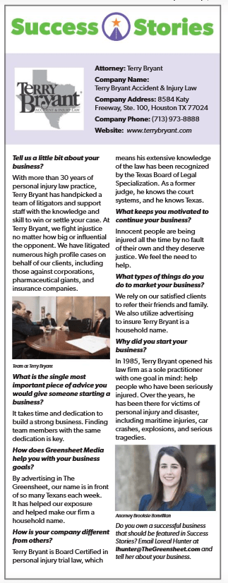 With more than 40 years of personal injury law practice, Terry Bryant has handpicked a team of litigators and support staff with the knowledge and skill to win or settle your case. Our Texas personal injury attorneys have what it takes to get people like you the compensation you deserve. View Entire Success Stories Article