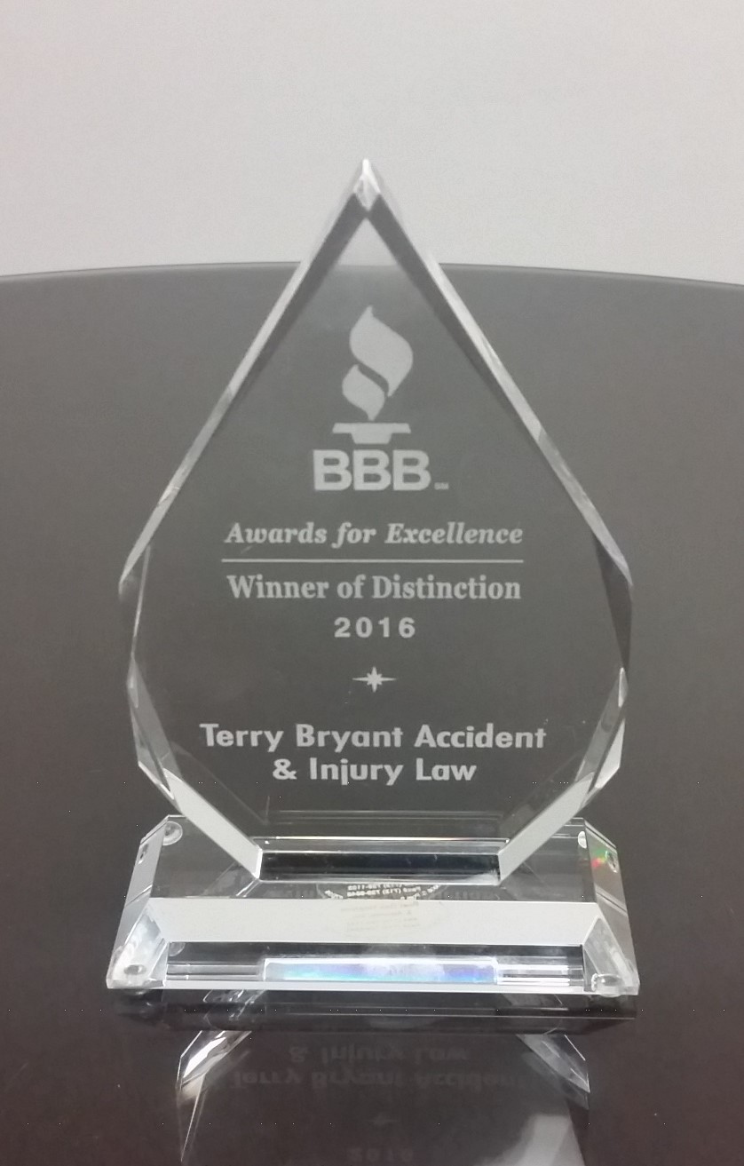 Each year, the Better Business Bureau recognizes businesses and non-profits for their achievements and superior commitment to quality and ethics in the workplace, including outstanding professionals such as a work injury lawyer who uphold these principles. The Accident and Injury Law Office of Terry Bryant, represented byTerry Bryant Accident & Injury, represented by was one of a select few of companies recognized at the annual Better Business Bureau Awards for Excellence on May 11, 2016. Recognized as a Winner of Distinction in the category for Attorneys, this was the second year in a row to be selected by the Better Business Bureau for service excellence.