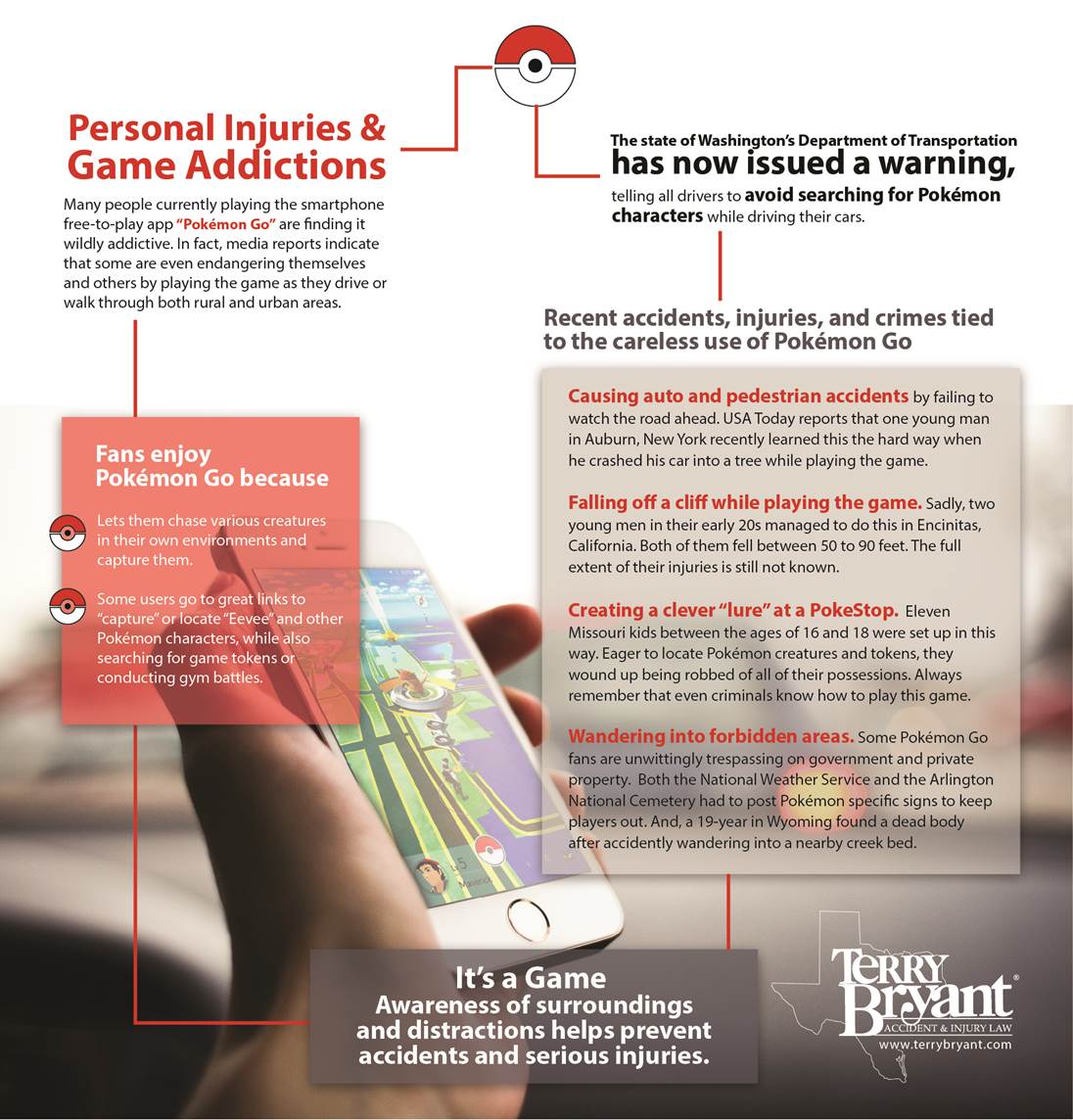We all need to embrace the real world every single day – and only use our phones for playing games while carefully seated at home. No further Pokémon Go injuries should be tolerated, especially those inflicted by those carelessly driving while playing the game. It’s possible that more cities will begin ticketing those who “text while walking” like Fort Lee, New Jersey. Even greater penalties, such as distracted driving penalties, should be passed for playing cell phone games while driving.