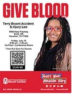 On July 15, 2022, Terry Bryant Accident & Injury Law will be hosting our annual blood drive from 9 a.m. to 1:30 p.m. Sign up today to make a difference in someone’s life. Our donation site is 8584 Katy Freeway, Houston TX, 77024 (1st Floor Conference Room).