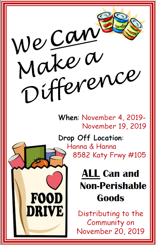 For the second year Terry Bryant Accident & Injury Law is happy to join our friends and neighbors at Hanna & Hanna by contributing non-perishables to their Food Drive. Learn More
